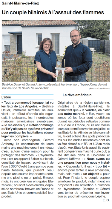 Dans ce portrait sincère et inspirant, nous avons eu l’opportunité de partager l’origine de ce projet né d’un sentiment d’impuissance face aux incendies ravageurs aux États-Unis, et mûri ici, à Saint-Hilaire-de-Riez. L’article raconte notre volonté de créer un système de prévention capable de protéger les habitations et soulager les pompiers lors des feux de végétation ou de forêts.