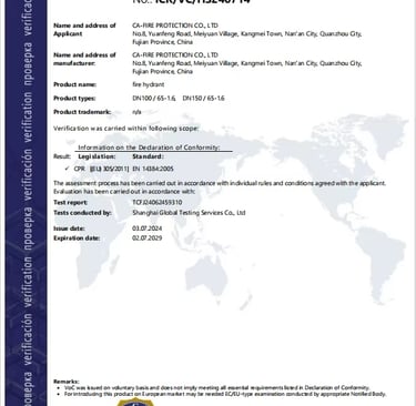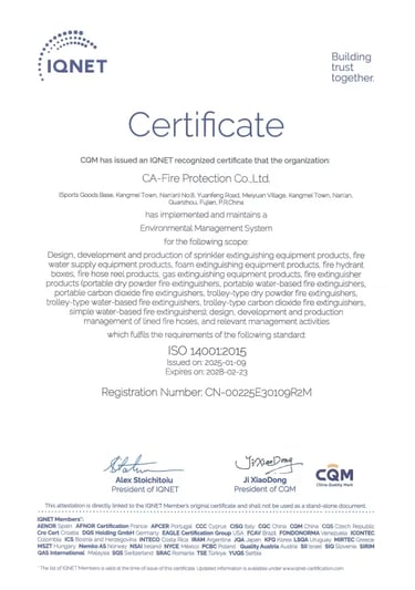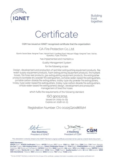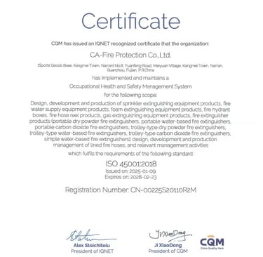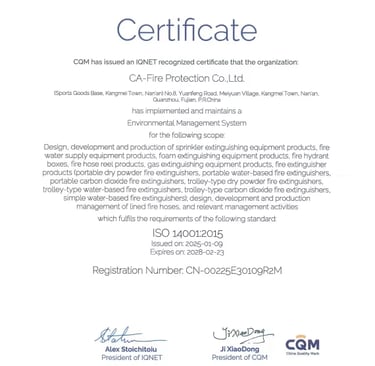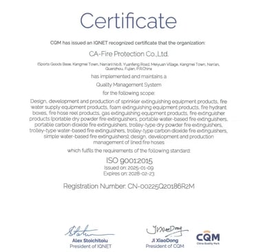 CA Fire s’est dotée d’un système de contrôle qualité rigoureux et d’outils d’inspection technique de haut niveau. L’entreprise est certifiée ISO 9001:2015, ISO 1400 et ISO 45001:2018. Plusieurs de ses équipements sont homologués aux normes (certification 3C) et validés par le Ministère de la Sécurité Publique. Certains modèles, comme des sprinklers spécifiques, bénéficient également de certifications internationales, leur permettant de s’intégrer dans des projets conformes aux exigences NFPA (normes américaines) ou EN (normes européennes).