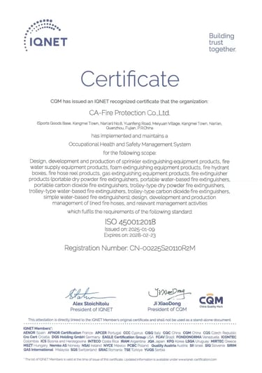 CA Fire Protection Co. LTD est aujourd’hui reconnu comme un fabricant d’envergure internationale dans le domaine de la sécurité incendie. Fondée en 2012 dans la province du Fujian ( Chine ), l’entreprise s’appuie sur un pôle industriel avancé et concentre en interne la recherche, le développement, la production, la vente et le service. Elle dispose d’une infrastructure industrielle de plus de 50 000 m², animée par plus de 100 collaborateurs, dont 10 ingénieurs spécialisés, possède plus de 80 brevets et une gamme de produit complète pour la protection contre les incendies industrielles notamment.